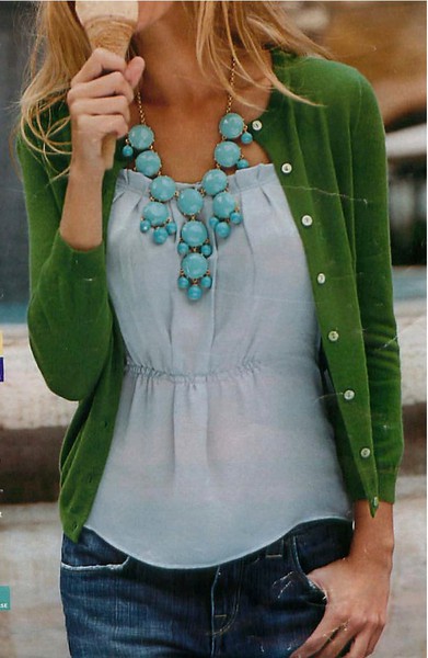 If your favorites are neutral colors, then a jewelry accessory of color makes a statement. The size of the beads should depend on what you feel comfortable wearing. Sometimes instead of a single large bead necklace or bracelet, you might select a multi-strand of smaller size beads.